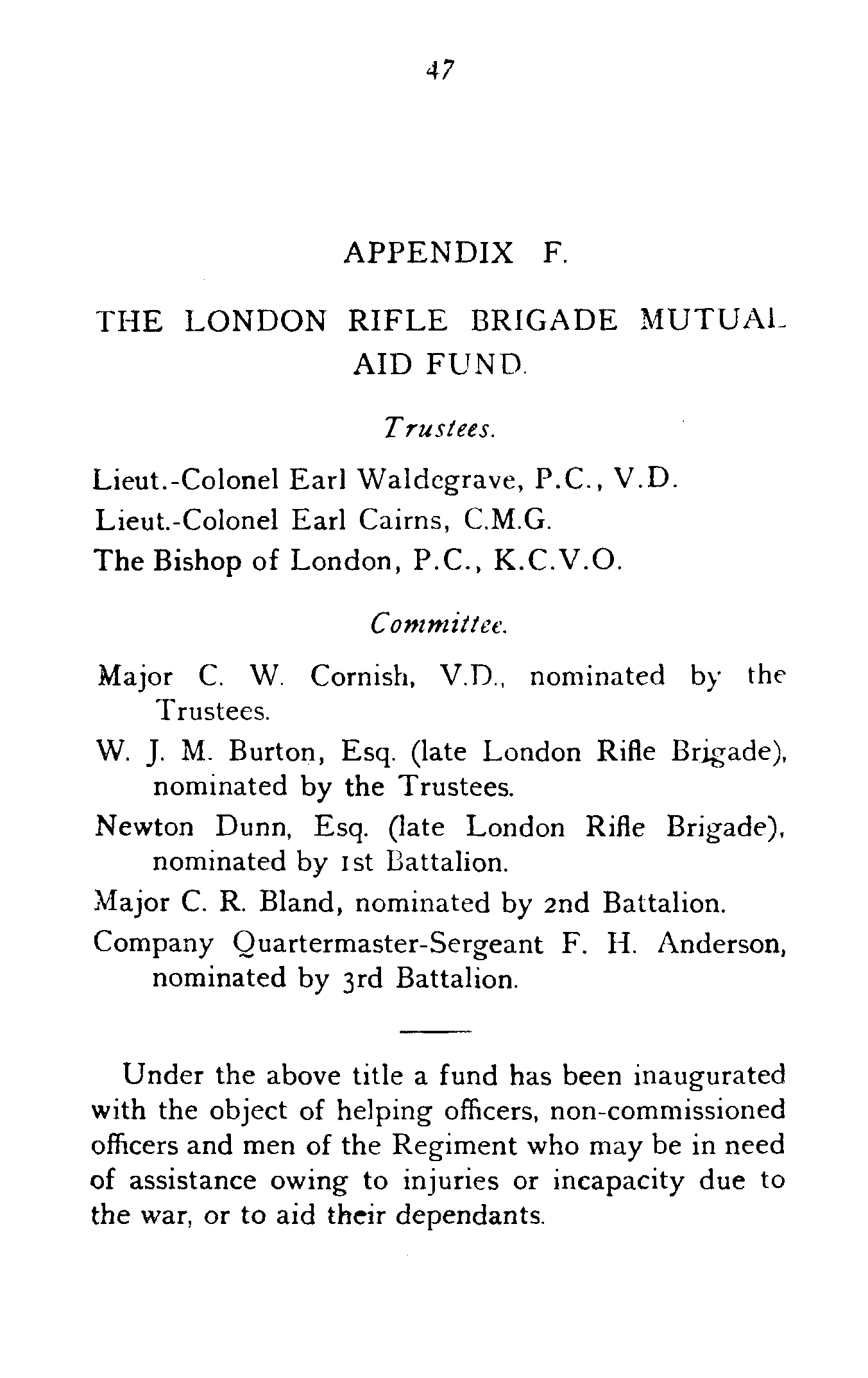 The Fund is administered by a Committee of five members, two of whom have been nominated by the Trustees, and are old members of the Regiment, and one member for each of the three Battalions, to be nominated by the Officers Commanding.