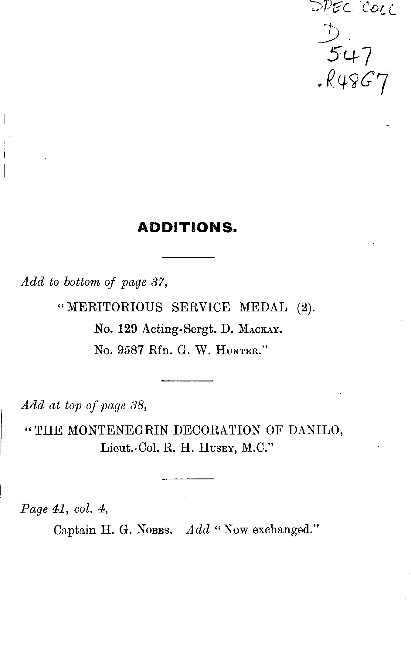 ADDITIONS, after adding the corrections to these pages, the entries were changed to match the format of the rest of the entries. The original format can be found on the last page of the text.