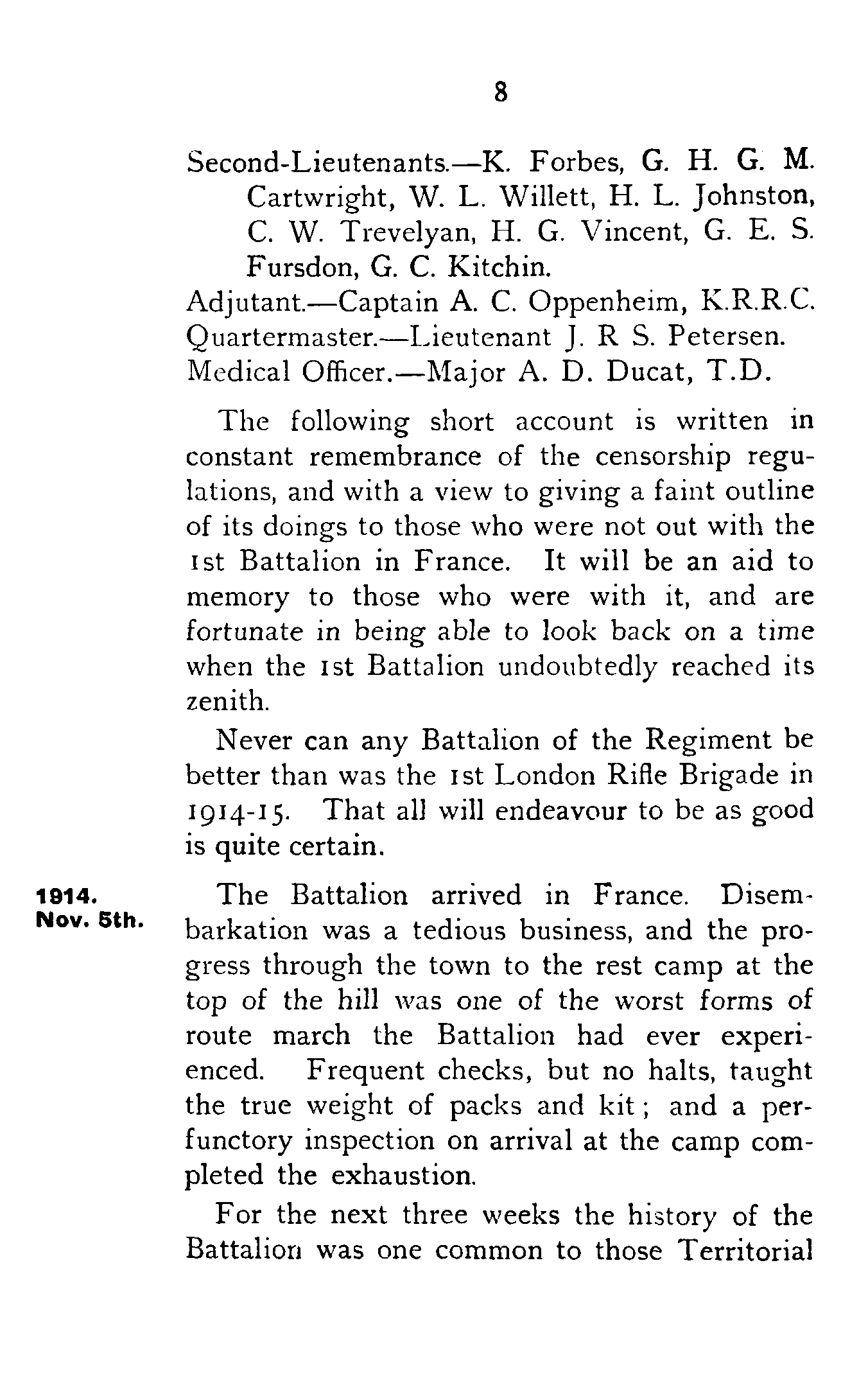 The following short account is written in constant remembrance of the censorship regulations, and with a view to giving a faint outline of its doings to those who were not out with the 1st Battalion in France. It will be an aid to memory to those who were with it, and are fortunate in being able to look back on a time when the 1st Battalion undoubtedly reached its zenith.
