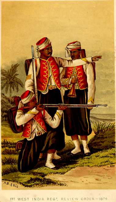 The plan of a local colonial army was, however, first tried in the West Indies. At the close of the last century, when the West India Islands, or the Plantations, as they were then called, were of as much importance to, and held the same position in, the British Empire as India does now,[Pg 3] there was in existence a West India Army, consisting of twelve battalions of negro troops, raised exclusively for service in the West Indies.