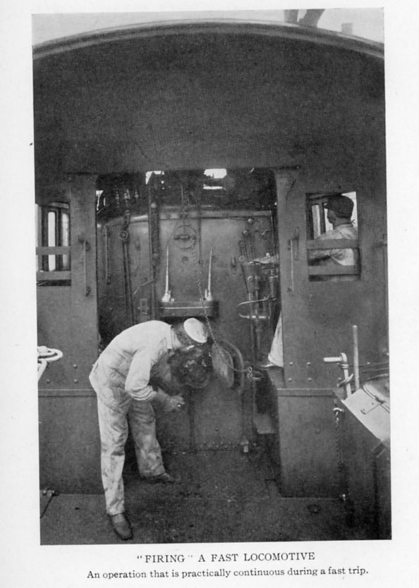 Down in the pit of the engine-cab the fireman, a great shovel in his hands, stood ready to feed the ravenous fires. Every minute or two he pulled the chain and yanked the furnace door open to throw in the coal, shutting the door again after each shovelful, to keep the fire hot.