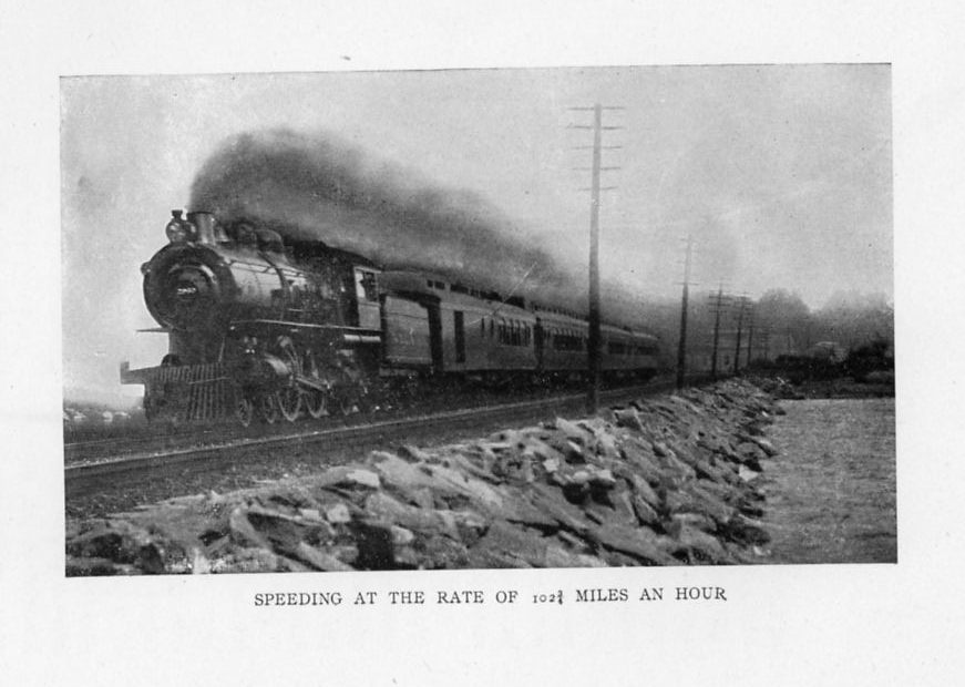 The conductor stood at the end of the train, watch in hand, and at the moment when the hands indicated the appointed hour he leisurely climbed aboard and pulled the whistle cord. A sharp, penetrating hiss of escaping air answered the pull, and the train moved out of the great train-shed in its race against time. It was all so easy and comfortable that the passengers never thought of the work and study that had been spent to produce the result. The train gathered speed and rushed on at an appalling rate, but the passengers did not realise how fast they were going unless they looked out of the windows and saw the houses and trees, telegraph poles, and signal towers flash by.