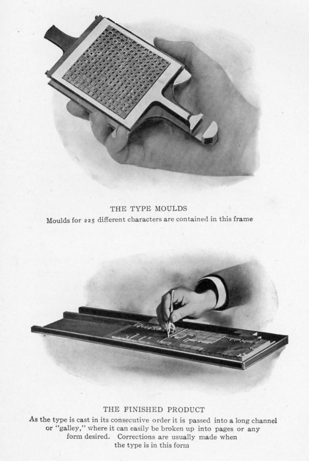 In a page of this size there are more than a thousand separate pieces of type, which, if set by hand, would have to be taken one by one and placed in the compositor's "stick"; then when the line is nearly set it would have to be spaced out, or "justified," to fill out the line exactly. Then when the compositor's "stick" is full, or two and a half inches have been set, the type has to be taken out and placed in a long channel, or "galley." Each of these three operations requires considerable time and close application, and with each change there is the possibility of error. It is a long, expensive process.