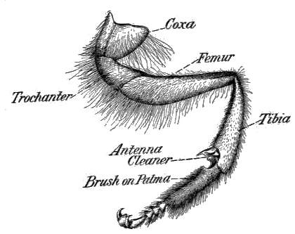 Of these two classes the branched hairs are the more numerous. They make up the hairy coat of the head, thorax, and abdomen, with the exception of short sensory spines, as those found upon the antennę and perhaps elsewhere, and the stiff unbranched hairs which [8] cover the surfaces of the compound eyes (Phillips, 1905). Branched hairs are also found upon the legs; more particularly upon the more proximal segments. A typical branched hair is composed of a long slender main axis from which spring numerous short lateral barbs. Grains of pollen are caught and held in the angles between the axis and the barbs and between the barbs of contiguous hairs. The hairy covering of the body and legs thus serves as a collecting surface upon which pollen grains are temporarily retained and from which they are later removed by the combing action of the brushes of the legs. Although, as above noted, some unbranched hairs are located upon the body of the bee, they occur in greatest numbers upon the more distal segments of the appendages. They are quite diverse in form, some being extremely long and slender, such as those which curve over the pollen baskets, others being stout and stiff, as those which form the collecting brushes and the pecten spines.