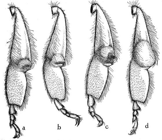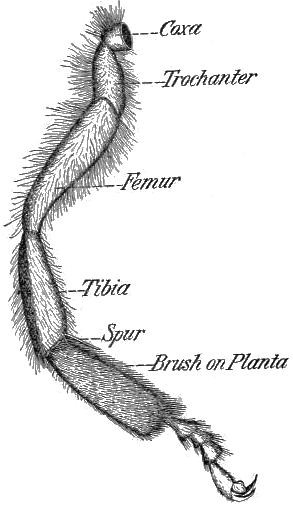 It is also possible that, in transferring pollen from the middle leg of one side to the planta of the opposite hind leg, the middle-leg brush may touch and rub over the pecten of the hind leg and thus directly place some of its pollen behind the pecten spines. Such a result is, however, very doubtful.