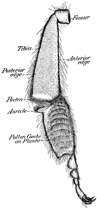 The broad, flat planta (metatarsus or proximal tarsal segment of the hind leg) is marked on its inner surface by several rows of stiff, distally directed spines which form the pollen combs. About 12 of these transverse rows may be distinguished, although some of them are not complete. The most distal row, which projects beyond the edge of the planta, is composed of very strong, stiff spines which function in the removal of the wax scales (Casteel, 1912). The upper or proximal end of the planta is flattened and projects in a posterior direction to form the auricle. The surface of the auricle is marked with short, blunt spines, pyramidal in form, and a fringe of fine hairs with branching ends extends along its lateral edge. This surface slopes upward and outward.