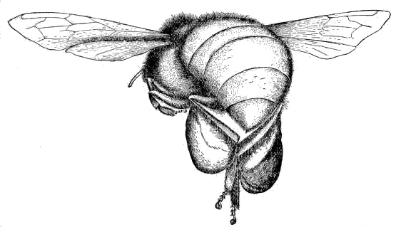 If the collecting bee is seized with forceps and examined after it has crawled over the stamens of a few flowers of the corn, its legs and the ventral surface of its body are found to be thickly powdered over with pollen. If the bee hovers in the air for a few moments and is then examined very little pollen is found upon the body or upon the legs, except the masses within the pollen baskets. While in the air it has accomplished the work of collecting some of the scattered grains and of storing them in the baskets, while others have been brushed from the body.