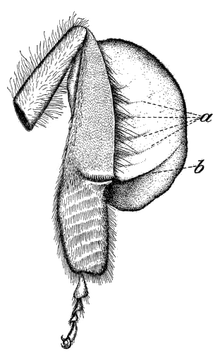 The auricle plays a very essential part in the process of loading the basket. This structure comprises the whole of the flattened proximal surface of the planta, except the joint of articulation itself, and it extends outward in a posterior direction a little beyond the remaining plantar edge. The surface of the auricle is covered over with many blunt, short spines and its lateral margin is bounded by a row of short rather pliable hairs, branched at their ends. When [21] the planta is flexed the auricle is raised and its surface approaches the distal end of the tibia, its inner edge slipping up along the pecten spines and its outer hairy edge projecting into the opening which leads to the pollen basket. (See fig. 8, b.) With each upward stroke of the auricle small masses of pollen which have been scraped from the plantar combs by the pecten are caught and compressed between the spiny surface of the auricle and the surface of the tibia above it. The pressure thus exerted forces the pasty pollen outward and upward, since it can not escape past the base of the pecten, and directs it into the entrance to the corbicula. The outward and upward slant of the auricular surface and the projecting hairs with which the outer edge of the auricle is supplied also aid in directing the pollen toward the basket. Sladen (1911) states that in this movement the weak wing of the auricle is forced backward, and thus allows the escape of pollen toward the basket entrance, but this appears both doubtful and unnecessary, since the angle of inclination of the auricular surface gives the pollen a natural outlet in the proper direction.