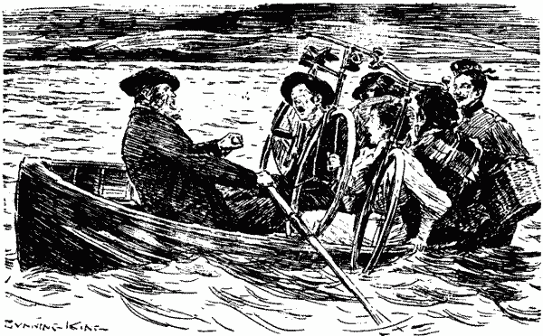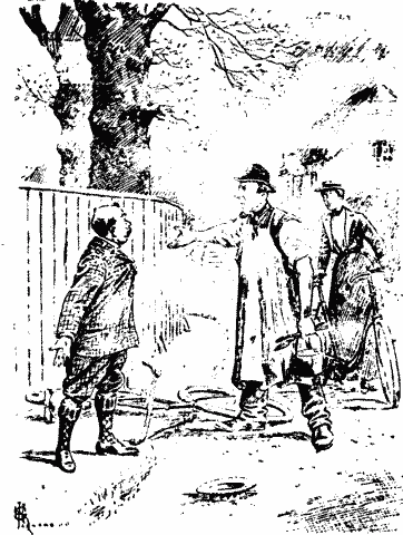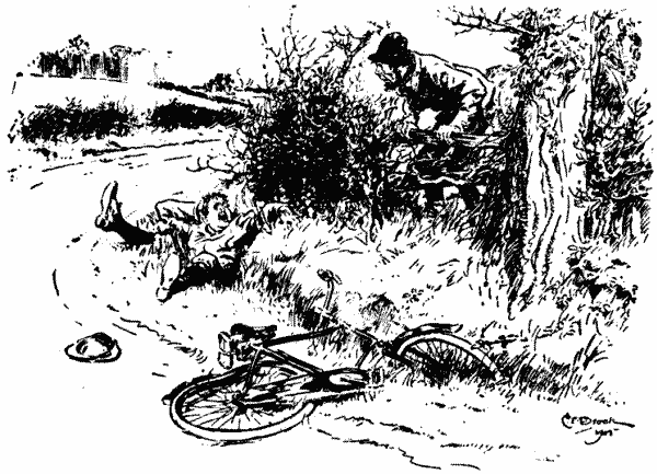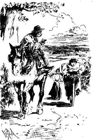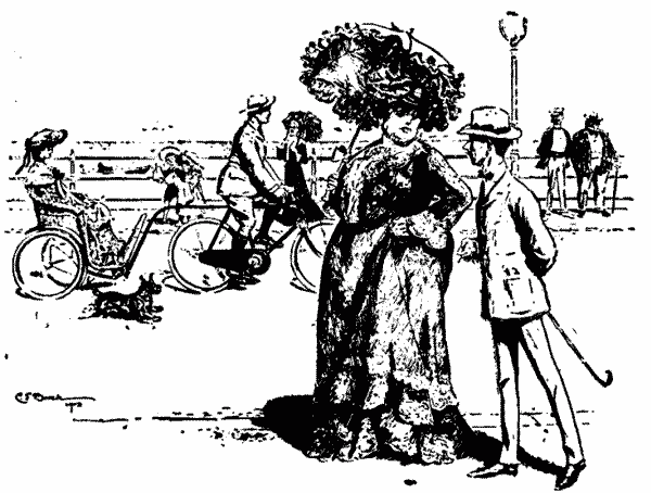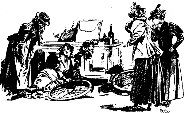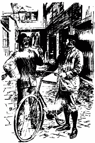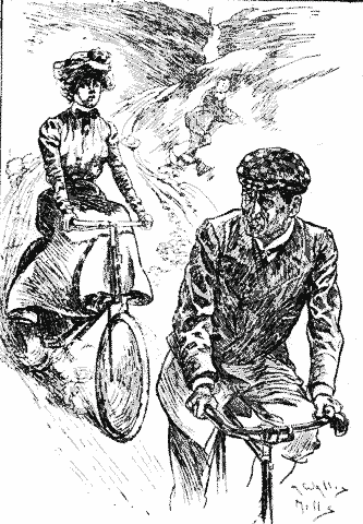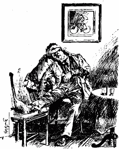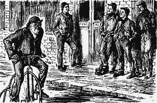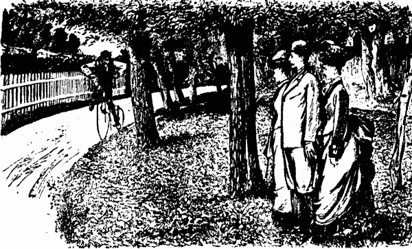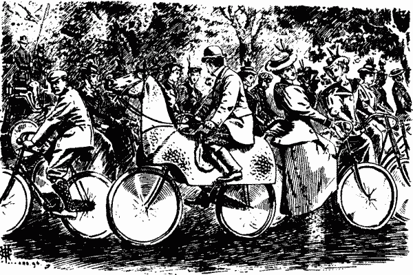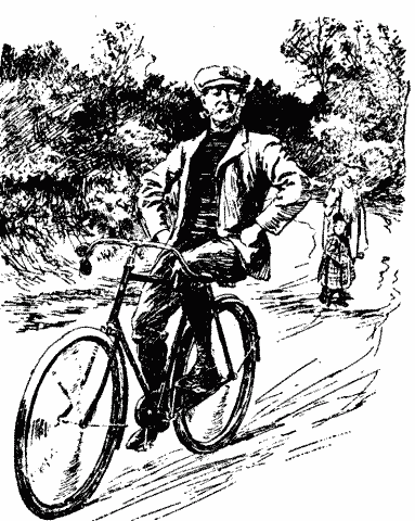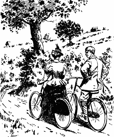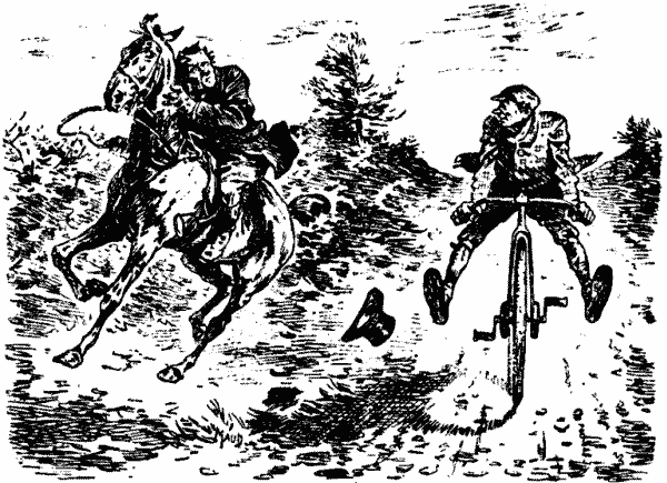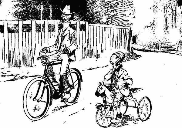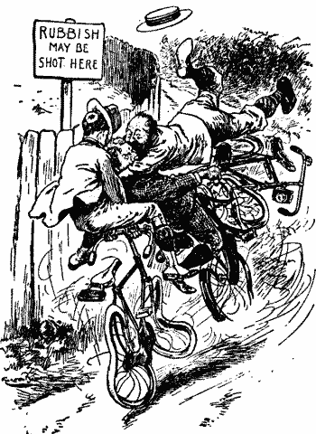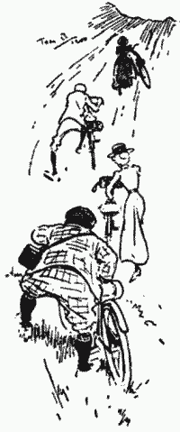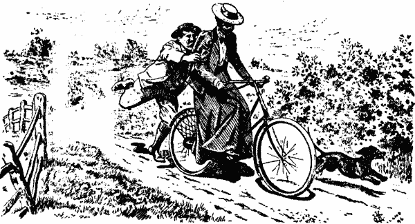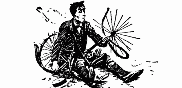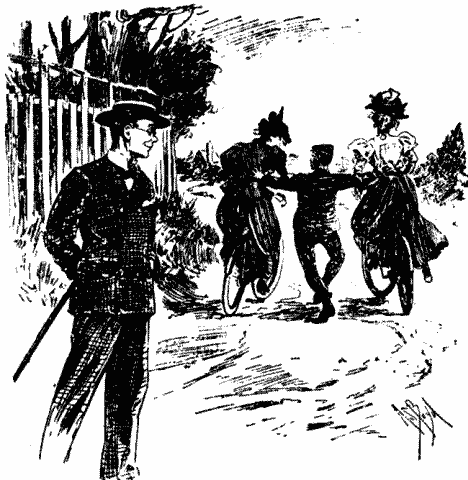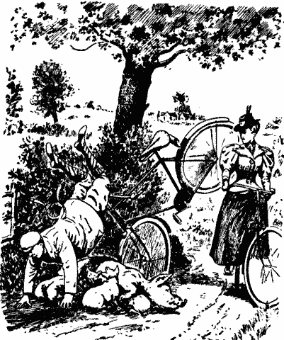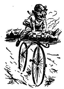 5. Get someone to hold you on. Engage a friend in an interesting conversation while you[Pg 16] mount your bicycle. Do you remember Mr. Winkle's dialogue with Sam Weller when he attempted skating? You can model your conversation on this idea. Friend will support you while you ride and talk. Keep him at it. It will be excellent exercise for him, physically and morally. Also economical for you; as, otherwise, you would have to pay a runner.