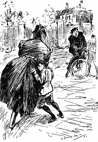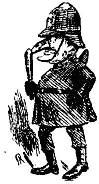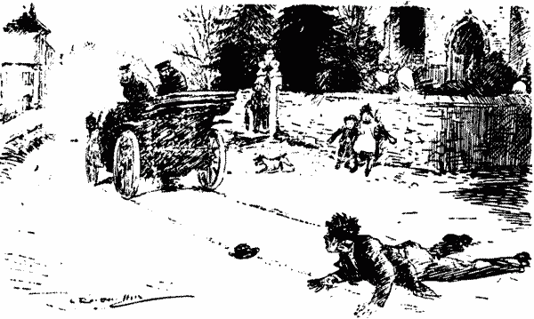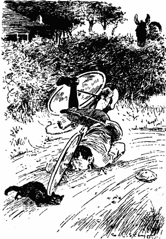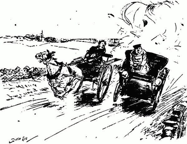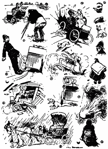 "Started away and turned on full head of smell—steam, I mean. Over Southwark Bridge, fizz, kick, bang, rattle! Flew along Old Kent Road; knocked down two policemen on patrol duty ('Knocked 'em in the Old Kent Road'); fizzed on through New Cross and Lewisham at awful nerve-destroying, sobbing pace, 'toot toot-ing' horn all the way. No good, apparently, to some people, who would not, or possibly could not, get out of the way. Cannoned milk-cart entering Eltham village, ran into 'bus, but shot off it again, at a tangent, up on to the footpath, frightening old lady into[Pg 8] hysterics. Onwards we went, leaping and flying past everything on the road, into open country. Ran over dog and three chickens, and saw tandem horses take fright and bolt; dust flew, people yelled at us and we yelled at people. Came round sharp corner on to donkey standing in road. 'Boosted' him up into the air and saw him fall through roof of outhouse! Whirr-r-up! bang! rattle! fizz-izz—Bust!
