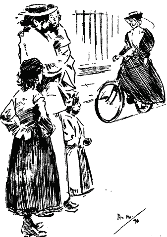 Dear Mr. Punch,—Knowing you to be a past master in the art of courtesy, I venture to submit the following hard case to your judgment. The other morning, being a none too experienced cyclist, I ventured into the Park on my "wheel" at an early hour, thinking to have a little practice unobserved. Judge of my horror when, as I was wobbling along, I was suddenly confronted by the Duchess of Xminster and her daughters, all expert riders! Her Grace and the Ladies Wiseacre bowed to me in the most affable way, but, afraid to leave go of the handles of my machine, I could only NOD in return. And I have always been renowned for the elegance with which I remove my chapeau! These noble ladies have since cut me dead. I cannot blame them, but I venture to suggest, for your approval, that the raising of the right elbow, such as is practised by coachmen, gentle and simple, should be adopted by all cyclists. I think that I could manage the movement.