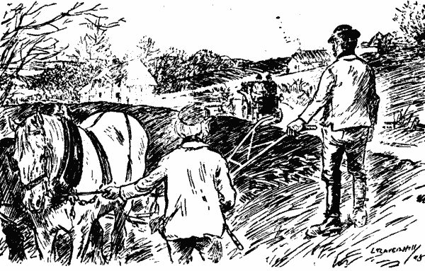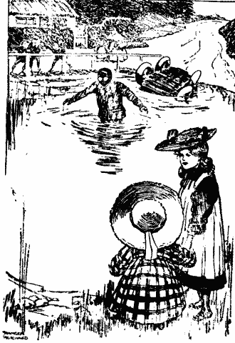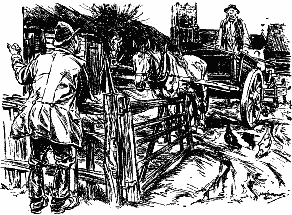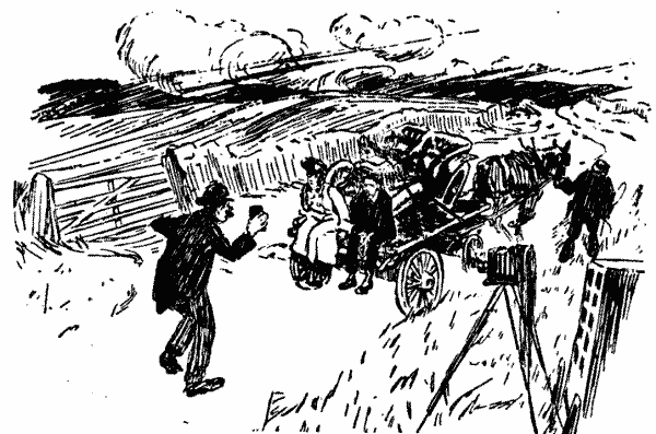 Cow-boy (to young lady who has taken refuge). "Would you mind openin' the gate, miss? They're a-comin' in there."
