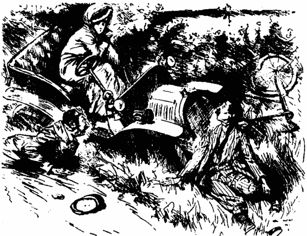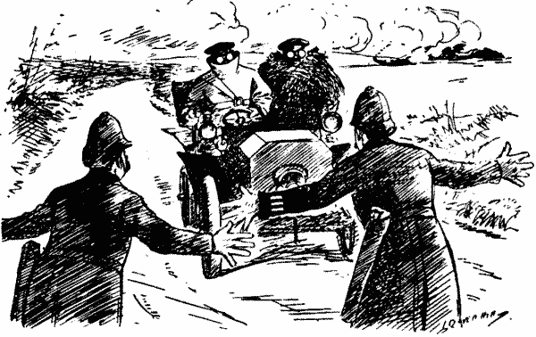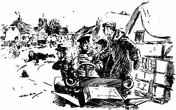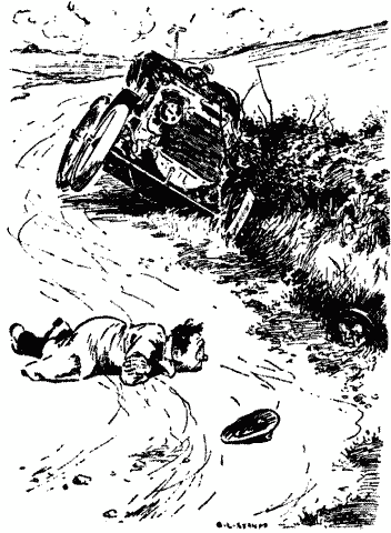 "Where am I?—Oh, in hospital—oh, really?—Seems nice clean sort of place.—How long——? Oh, been here about six weeks—have I, really? And what——? Oh, both arms, you say?—and left leg? Ah—by the way, do you know anyone who wants to buy a motor——? What, no motor left?—By Jove! that's funny, isn't it?—Well, I think I'll go to sleep again now."