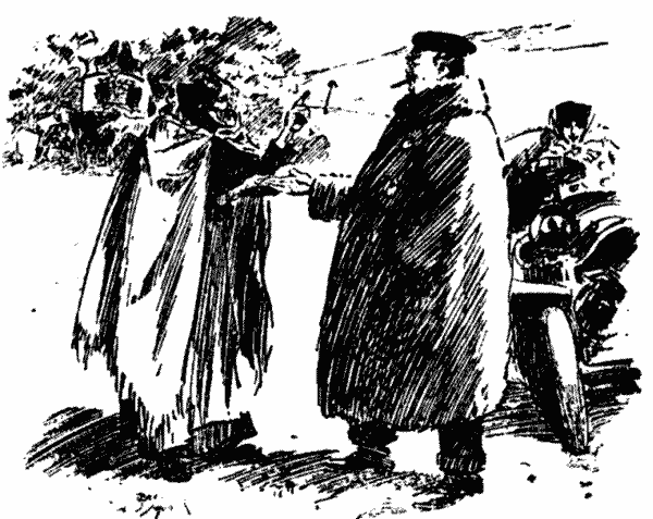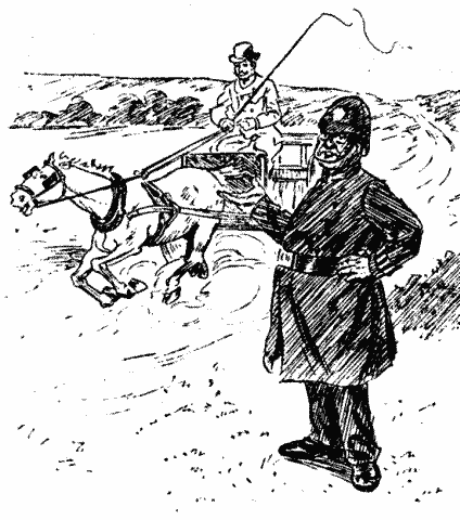 Sporting Constable (with stop-watch—on "police trap" duty, running excitedly out from his ambush, to motorist just nearing the finish of the measured furlong). "For 'evin's sake, guv'nor, let 'er rip, and ye'll do the 220 in seven and a 'arf!"