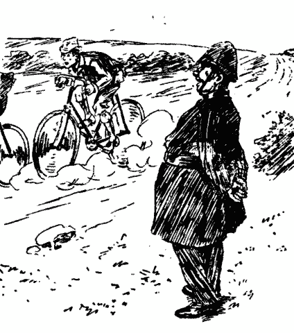 2. Learn on a hired machine. The best plan is to borrow a machine from a friend. It saves hiring. Should the tyre become punctured, the brake be broken, the bell cracked, the lamp missing, and the gear out of gear, you will return it as soon as possible, advising your friend to provide himself with a stronger one next time.