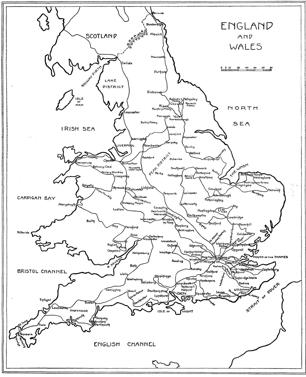 In this chronicle of a summer's motoring in Britain I have not attempted a guide-book in any sense, yet the maps, together with the comments on highways, towns, and country, should be of some value even in that capacity. I hope, however, that the book, with its many illustrations and its record of visits to out-of-the way places, may be acceptable to those who may desire to tour Britain by rail or cycle as well as by motor car. Nor may it be entirely uninteresting to those who may not expect to visit the country in person but desire to learn more of it and its people. Although our journey did not follow the beaten paths of British touring, and while a motor car affords the most satisfactory means of reaching most of the places described, the great majority of these places are accessible by rail, supplemented in some cases by a walk or drive. A glance at the maps will indicate the large scope of country covered and the location of most places especially mentioned in the text.