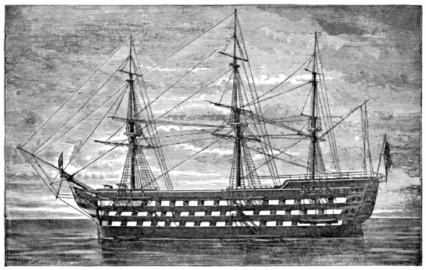 The “Victory” now no longer bears the Admiral’s flag; the increasing numbers of seamen in our depôts, rendered in 1869 a larger ship more convenient, and she is retained in her position in the harbour solely as a reminiscence of the past; and it almost seems a pity that she cannot be now fitted up internally, as nearly as possible as she was at Trafalgar, that the thousands of annual visitors might form a better idea of the state of the decks of a man-of-war of the olden time when going into action; and that in these days of rapid and enormous changes in both shipbuilding and ordnance, a type of the man-of-war that won England her pre-eminence, might be preserved to all time.