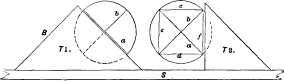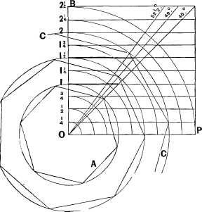 | To find what a square body which measures one inch on each side measures across the corners; to find what diameter a cylindrical piece of wood must be turned to which is to be squared, and each side of which square must measure an inch | 136 |