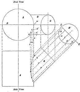 | The different views of a mechanical drawing; elevation; plan; general view; a figure to represent a solid cylinder | 94[viii] |