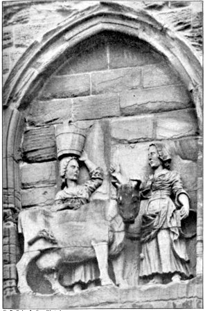 A sculptured panel on the north-west turret of the Nine Altar Chapel is now known as the Dun Cow. The original sculpture was replaced in the last century by the existing panel, but the legend connected with it is interesting. After their flight from Chester-le-Street, the monks, bearing the body of S. Cuthbert, remained some time at Ripon. While trying to return to Chester-le-Street, at a place called Wardlaw, the coffin stuck fast, and remained absolutely fixed. A fast of three days was proclaimed and kept, when it was revealed to them that they were to carry their saint to Dunholme. Still they were in difficulties, not knowing where Dunholme was, but fortune, or Providence, again favoured them. A woman, who had lost a cow, passed, calling to a companion to inquire if she had seen the animal. The reply was that her cow was in Dunholme; and, to the relief of the monks, they and their precious charge soon safely arrived there. In grateful 36 commemoration of the incident Flambard erected this monument of a milkmaid and her cow. (See p. 9.)