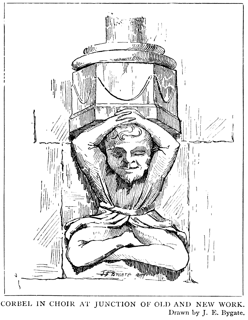 The Tower is carried on four large clustered Norman piers with semi-circular arches. Over the arches, and seventy-seven feet above the floor of the church, is the lower stage of the lantern, round which is a gallery with an open pierced parapet. It rests on corbels, each alternate one being carved with a grotesque head. The walls are panelled up to the base of the great windows,—each panel having two cinquefoiled arches under a crocketed canopy and final; while between them are small buttresses, also panelled, and ending in a finial which reaches the same height as the canopy. Over the panelling is a string course ornamented with that characteristic ornament of the Perpendicular period, the Tudor flower, and above this on each face two tall windows near together. Each window has two lights, and is divided by a transom. The roof of the lantern is groined, with fine bosses at the intersections of the ribs. The whole seen from below has a very fine effect, and must be very different in appearance from the original Norman structure. The whole of the 54 lantern was refaced, and the statues which had been removed from their niches were replaced, some thirty years ago, by the Dean and Chapter of Durham.