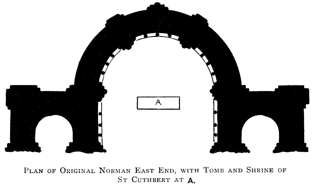 Approaching the Cathedral Church of Durham from the north by the large open space between it and the Castle, known as the Palace Green, we obtain a complete elevation of the whole structure. There is little room to doubt, though the details naturally vary with the date of erection, that the original plan of Carileph's church has been carried out in its entirety, with two exceptions. These are the addition of the eastern transept or nine altar chapel at the east, and the Galilee or Lady Chapel at the west end. The entire length of the building, not including the Galilee chapel, is 431 feet, which is made up as follows:—Nine altar chapel 51 feet, the choir 120 feet, the transept 57 feet, and the nave 203 feet.