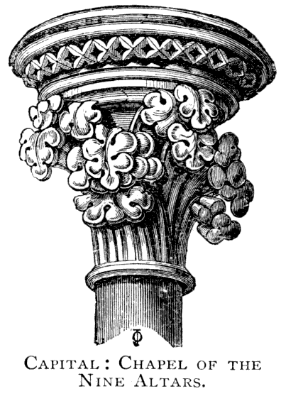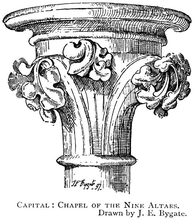 The East Front.—The circumstances which led to the removal of Carileph's apses and the erection of the eastern 25 transept have already been referred to. The present east end is divided into three bays by massive buttresses, each of which contains three lofty lancet windows separated by smaller buttresses. Over all, and in the gable, is the famous large rose window. The north and south ends of the transept are finished with the tall pyramidal pinnacles erected by Wyatt.