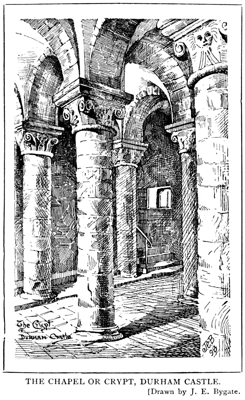Durham Castle owes its picturesque appearance to two causes—first, its magnificent and commanding position, on a rocky escarpment; and second, no doubt, to the many vicissitudes through which it has passed, the alterations and additions 107 made necessary by time and constant war, and later, the entirely different uses to which the building is put.