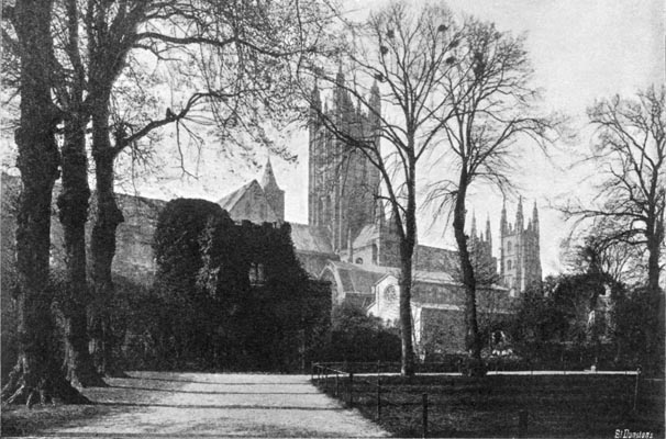 In the town itself, the best point of vantage from which the visitor can get a good view of the cathedral is the summit of the Dane John, a lofty mound crowned by an obelisk; from this height we look across at the roof and towers of the cathedral rising above thickly clustering trees: from here also there is a fine view over the beautiful valley of the Stour in the direction of Thanington and Chartham.