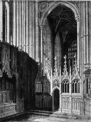 After the Restoration some attempt was made to render the cathedral once more a fitting place of worship, and the sum of £10,000 was devoted to repairs and other public and pious uses. A screen was put up in the same position as the former one, and the altar was placed in front. But, in a.d. 1729, this screen no longer suited the taste of the period, and a sum of £500, bequeathed by one of the prebendaries, was devoted to the erection of a screen in the Corinthian style, designed by a certain Mr. Burrough, afterwards Master of Caius College, Cambridge. A little before this time the old stalls, which had survived the Puritan period were replaced: a writer describes them, in the early half of the seventeenth century, as standing in two rows, an upper and lower, on each side, with the archbishop’s wood throne above them on the south side. This chair he mentions as “sometime richly guilt, and otherwise well set forth, but now nothing specious through age and late neglect. It is a close seat, made after the old fashion of such stalls, called thence faldistoria; only in this they differ, that they were moveable, this is fixt.”