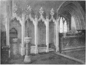 In the thirteenth century the east end of the choir seems to have been removed and the presbytery added: its date is pretty clearly determined by the east window, in which we notice some signs of the approaching change from the Early English simple lancet into the plate tracery of the Decorated period. Rickman gives its approximate date as 1220. During the fourteenth century the nave aisles were widened and extended farther west, and at the same time two bays were added to the nave itself. The Norman chapels on either [11] side of the choir were lengthened into aisles, not, however, extending as far to the east as the thirteenth-century presbytery; arches were cut in the Norman choir walls to give access to these new aisles. The transepts were lengthened, the south one by raising the walls of the Norman chapel mentioned above, which, it has been conjectured, was used as the Lady Chapel, the north transept by the addition of Bembre's chantry.