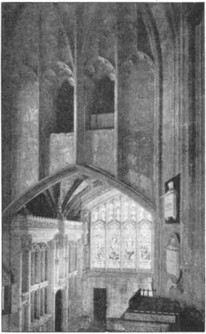 During the Early English period, probably by John de Berwick, who was dean from 1286-1312, a spire was added to the central tower. This was for long in an unsafe condition, and at length, in 1600, it fell. The following is the description given by Coker, a contemporary writer: "Having discoursed this longe of this church, I will not overpasse a strange accident which in our dayes happened unto it, viz. Anno Domini 1600 (the choire beeing then full of people at tenne of clock service, allsoe the streets by reason of the markett), a sudden mist ariseing, all the spire steeple, being of a very great height, was strangely cast downe, the stones battered all the lead and brake much timber of the roofe of the church, yet without anie hurt to the people; which ruin is sithence commendablie repaired with the church revenues, for sacriledge hath not yet swept awaye all, being assisted by Sir John Hannam, a neighbour gentleman, who if I mistake not enjoyeth revenues of the church, and hath done commendablie to convert part of it to its former use." Other accounts mention a tempest at the time of the fall. It is not unlikely that the tower was weakened by the alterations in the fourteenth century, when wider arches were cut in the west walls of the transepts, in consequence of the widening of the nave aisles. The fall of the spire, which fell towards the east, demolished the [12] clerestory windows of the choir on the south side, and their place was supplied by a long, low Tudor window oblong in shape and quite plain. The windows, however, on both sides have been entirely altered, and those now existing in the clerestory are small lancets of modern date.
