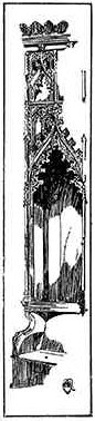 The arch moulding is enriched on the outer part with figures of fourteen female saints, and on the inner with twelve male [24]saints; the semi-hexagonal panelled buttresses are covered with the shields of the families of Erpingham, Clopton, and Walton, and each has a seated figure of an ecclesiastic on the top.
