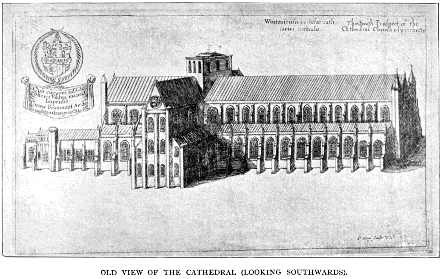 From Athelwold's death to the succession of Walkelin the history of the cathedral is little more than a record of its bishops; but with Walkelin we reach a very important epoch in its existence. In 1079, the Winchester Annals relate, this 7bishop began to rebuild the cathedral from its very foundations, as was commonly done by the Norman ecclesiastics of the time. According to this account, it was in 1086 that the king granted Walkelin, for the completion of his new building, as much wood from the forest of Hempage (three miles distant from the city on the Alresford road) as he could cut in four days and nights. Walkelin collected all the men he could, and within the given time removed the whole forest. The king, passing its site, cried: "Am I bewitched? or have I taken leave of my senses?" But the bishop, when he heard of his anger, pleaded to be allowed to resign the see if he might but keep the chaplaincy and the king's favour. At this William relented, saying: "I was as much too liberal in my grant as you were too greedy in availing yourself of it" (Willis). In 1093 the new church was formally consecrated, and on April 8, "in the presence of almost all the bishops and abbots of England, the monks came with the highest exultation and glory from the old minster to the new one: on the Feast of S. Swithun they went in procession from the new minster to the old one and brought thence S. Swithun's shrine and placed it with honour in the new buildings; and on the following day Bishop Walkelin's men first began to pull down the old minster, and before the end of the year they demolished the whole of it, with the exception of one apse and the high altar." When the old high altar was pulled down, we are told, "the relics of many saints were found." The cathedral, as Walkelin designed it, was for the most part so strong that its core and much of its actual work remains to this day; but the central tower lacked the stability of the rest, for on October 7, 1107, during the vacancy which occurred after Walkelin's death, it fell. The monkish chroniclers attributed the fall to the fact that William Rufus, "who all his life had been profane and sensual and had expired without the Christian viaticum" (Rudborne), was interred beneath it in 1100. William of Malmesbury, however, with a degree of incredulity rare in his days, says it may have been that it would have fallen in any case "through imperfect construction." He describes the burial thus:—"A few countrymen conveyed the body, placed on a cart, to the cathedral of Winchester, the blood dripping from it all the way. Here it was committed to the ground within the tower, 8attended by many of the nobility, but lamented by few. The next year the tower fell; though I forbear to mention the different opinions on this subject, lest I should seem to assent too readily to unsupported trifles."