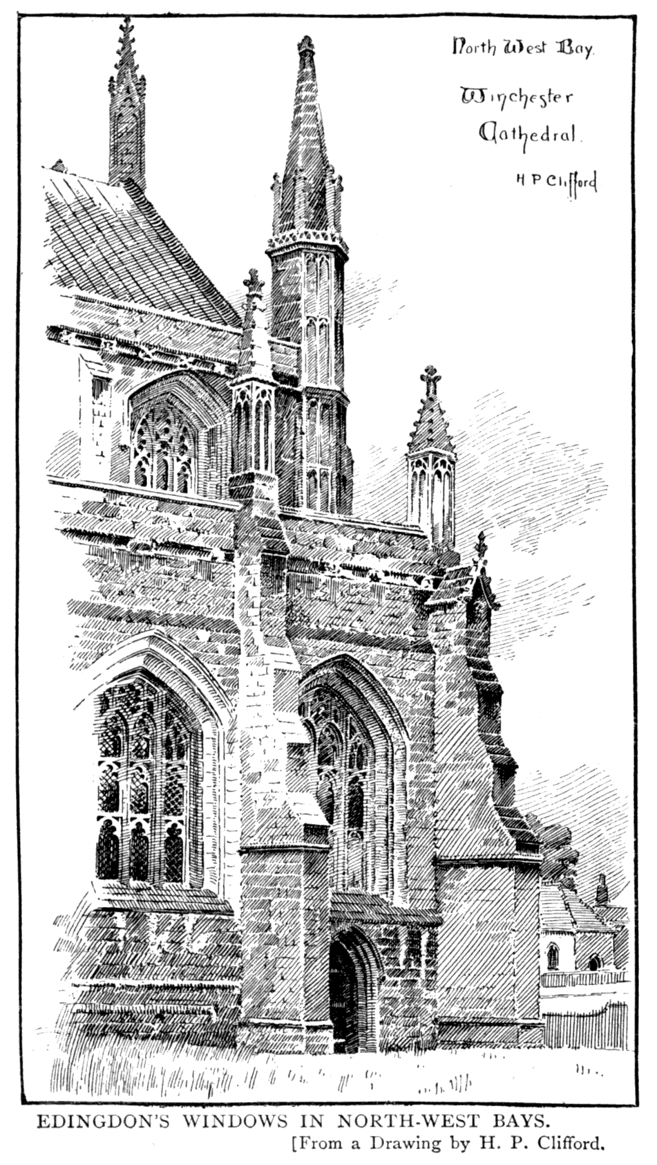 The West Front, the work of Bishop Edingdon, has been roughly handled by its critics, though Britton calls it a fine specimen of Perpendicular architecture. The original Norman work demolished by Edingdon was, as excavations have proved, forty feet in advance of the present façade. To judge by 23accounts of the destroyed portions, the west front in its earlier state must have been far more imposing than it is at present, for not only is it now commonplace in mass, but even the detail has no particular charm to atone for the change. The whole of this work appears so thoroughly Perpendicular in character that it has been questioned whether at such an early date as that to which it is assigned the style can have been so far developed. Woodward, indeed, though attributing to Edingdon the walls and the principal part of the west end, declares the tracery, the fronts of the porches, and much of the panelling to be later; but a comparison of Winchester with another church undoubtedly built by this bishop, at his native town of Edingdon, in Wiltshire, supports the tradition which credits him with its erection. Besides this evidence, we have additional proof in the fact that he left by his will certain property to be devoted to the completion of the nave. Late though his work may appear at first sight, yet when it is closely examined and compared with Wykeham's work the difference is very apparent.