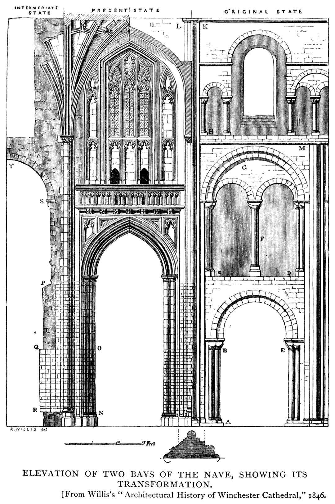 It is needless to add any further explanation, since the diagram fully explains both the present state of the nave and the manner in which the transformation from the original Norman design was brought about; but it may be worth while 38to quote an architect's verdict on the general effect of Wykeham's work in the nave. "If we cannot admire all the details," says this writer, "we can but bear tribute to the conception of the whole. Its lofty arcades give no space for triforium, and the proportion between the clerestory and the arcade is somewhat unsatisfactory. If we except the vaulted roof, and the chantry of the great Wykeham himself, and his predecessor Edingdon, this portion of the church may, with reason, be considered simple in its character, and bears distinct evidence of having been grafted on earlier work. The Norman columns still remain in one or two places towards the east end of the nave arcade, but with the exception of these and of the Norman masonry existing in the piers on the south, and perhaps portions of the aisle walls, all is transformed to Perpendicular detail" (The Builder, October 1892).