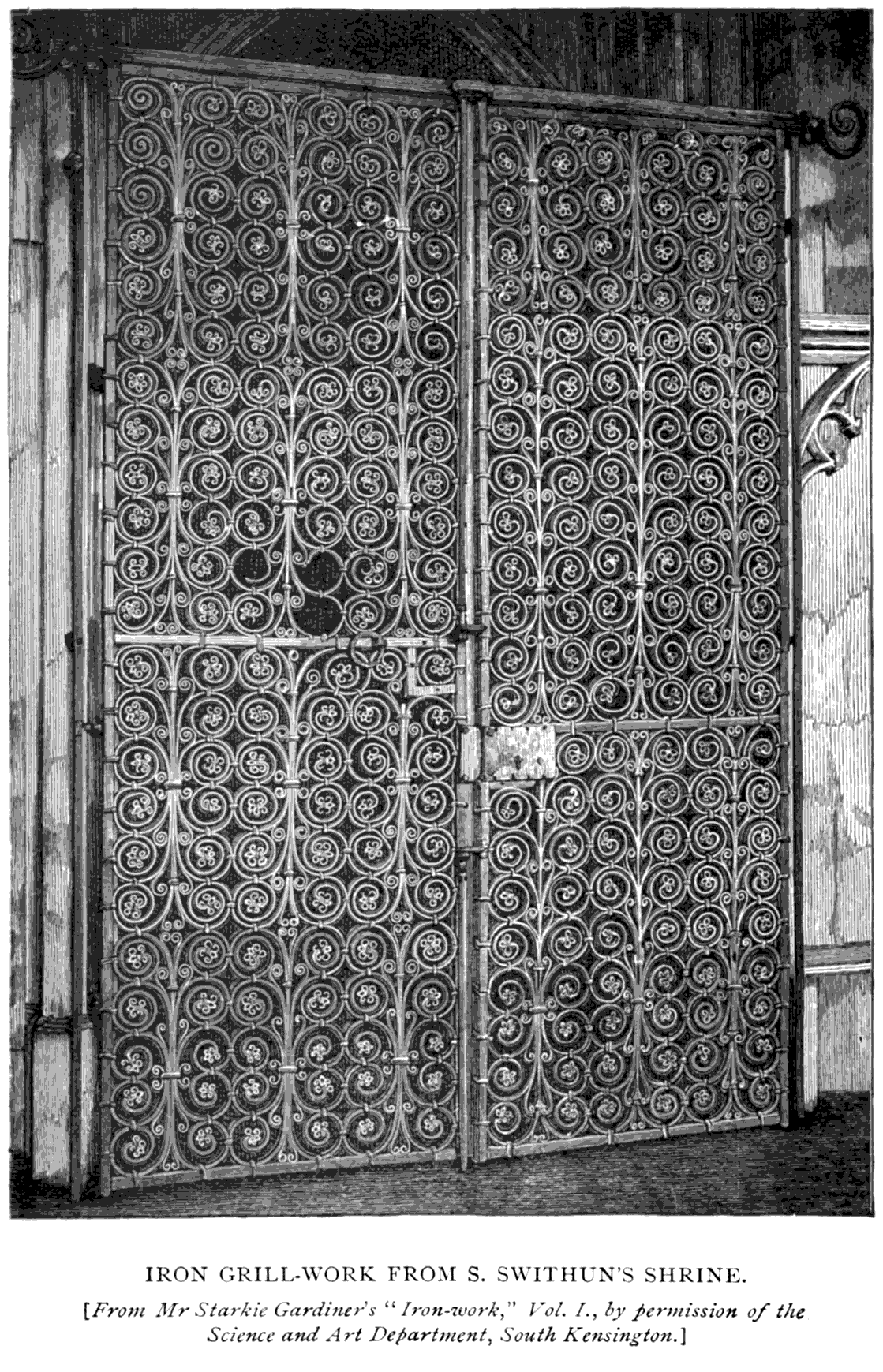 Near this, at the western end of the north aisle, is a door made up of four pieces of iron Grill-work, which originally stood at the top of the steps leading up from the south transepts to the retro-choir. The place where it used to be is still pointed out, and indeed marks are visible in the piers to which it was secured. A paper read to the Society of Arts by Mr J. Starkie Gardiner, describes the door as being, from its style, "the oldest piece of grill-work in England. The design is composed of sprays formed of two rolls of scrolls, welded to a central stem, like a much-curled ostrich feather, with lesser scrolls in the interstices and the major scrolls, each terminating in an open-work trefoil, or quinquefoil. The large scrolls are 5½ in. in diameter and rather stout, the grill possessing great resisting powers, though it would not be hard to climb.... There is, unfortunately, no means of fixing the date, since no other grill resembles it; but, from the position indicated in the cathedral, it may well have been made as long ago as the eleventh or twelfth century." It was originally intended to keep the miscellaneous crowd of pilgrims to the shrine of S. Swithun from penetrating farther into the church by way of the south transept. They were obliged to enter and depart by the Norman doorway in the north transept.