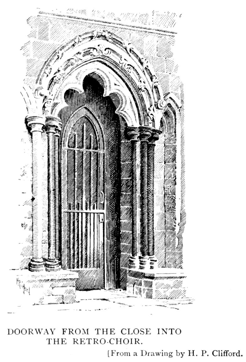 17The ground covered by the actual building is one and a half acres in extent. The close is fine and extensive, and is surrounded by a high and stout wall which marks the limits of the old Benedictine monastery. The houses within the close are of widely different dates, from the Early English period to recent years. They comprise the official residences of the dean and the canons, together with some private houses. The changes made from time to time in the distribution of the ground have involved the disappearance of the old priory buildings, and it is not possible to trace with certainty their original form. The laying out of the close has concealed the ground plan of the cloisters which once adjoined the cathedral. What is now called by the name is the passage between the south transept and the former chapter-house, which was pulled down in 1570 by the destructive Bishop Horne, in order, it is said, that the lead in the roof might be sold. Five extremely fine Early Norman arches which were once part of the chapter-house still remain, and may be seen in a line with the end of the slype, beyond the south transept. Some traces of small arches on what is now the extreme outer wall of the transept mark where arcading once ran along the inner wall of the chapter-house. No vestige of the roof remains. The "slype" is a passage which was cut through the southern buttress by Bishop Curle, to put a stop to the constant use of the nave and south aisle as a thoroughfare by the townspeople. The anagrams on the walls commemorate the purpose of the passage; the first, on the western arch, reading:—