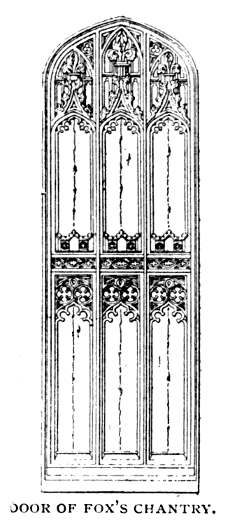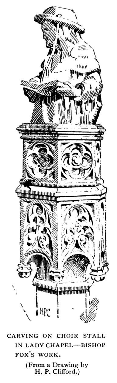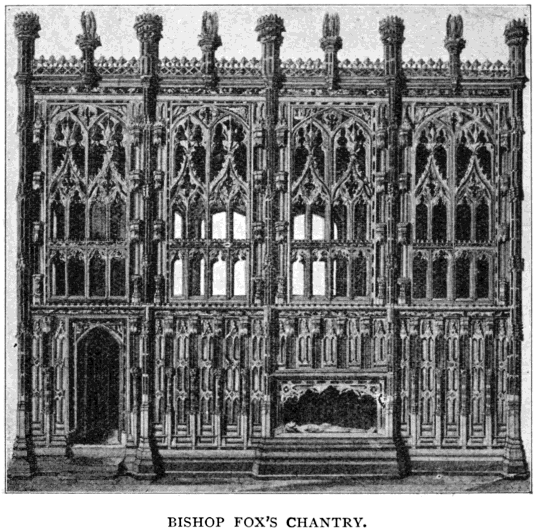 Richard Fox (1500-1528) was bishop successively of Exeter, Bath and Wells, and Durham before he was appointed to Winchester. Great confidence was reposed in him by Henry VII., who chose him as godfather of the future Henry VIII. To Fox is attributed the introduction of Wolsey to the king. Yet this appears to have failed to win him the cardinal's gratitude, for, according to Fuller: "All thought Bishop Fox to die too soon, only one excepted who conceived him to live too long, Thomas Wolsey, who gaped for his bishopric." With Hugh Oldham, bishop of Exeter, Fox was joint-founder of Corpus Christi College, Oxford, the pelican in her piety, which appears on the college arms, being borne by the bishop. His fine chantry and the reconstruction of the choir aisles bear witness to his interest in the fabric of his cathedral, and he is otherwise noted for the assistance he gave to various foundations.112