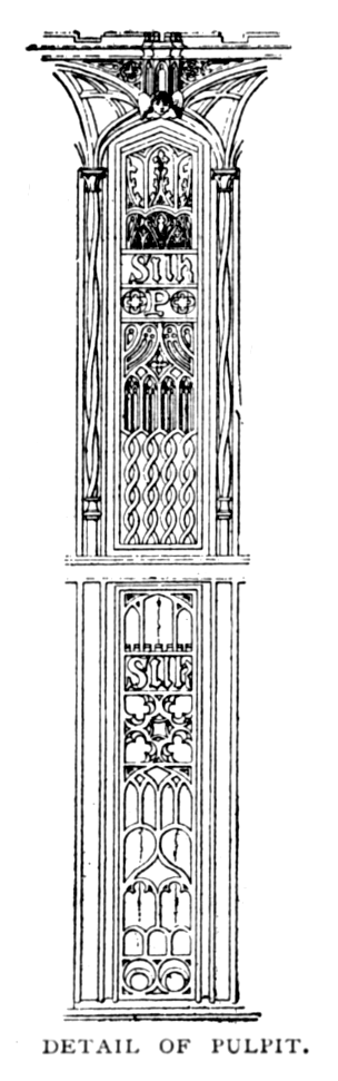 As one enters the Choir, which is raised above the level of the nave by the two sets of four steps, the stalls above-mentioned will be found to reach on either side from the eastern piers of the central tower to the first piers of the nave. They are of carved oak and are possibly the best existing 51examples of their date in England. The style is Early Decorated, and Willis points out the similarity between their canopies and gables and those of Edward Crouchback's chapel in Westminster Abbey. The details are varied and graceful, with the design of each pair coupled under a pointed arch with a cinquefoil in its head, which is again surmounted by a high crocketted gable. The oak has turned a superb hue with age, very different from the colour of the modern screen which is banked by the reveals of the old bishop's throne. The misereres below are much earlier in date than the canopies, but do not go quite so far back as those at Exeter, which may be assigned to about 1230. The desks and stools of the upper tier show the date 1540 and bear also the initials of Henry VIII., Bishop Gardiner, and Dean Kingsmill. The pulpit on the north side of the choir was given by Prior Silkstede, whose name it bears, and is also of finely carved work. Above the choir stalls on the northern side is the organ, which was repaired this year.