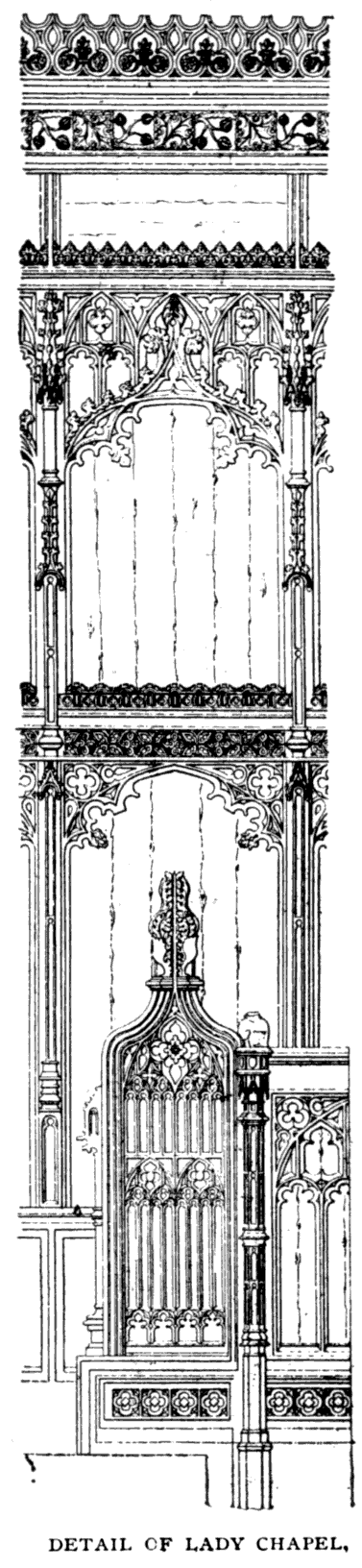 The Lady Chapel has at the end and at each side a fine seven-light Perpendicular window, the heads of the lights below the transom being cinquefoiled, while above each window is a cornice supported by small arches resting on corbels; over all is a pierced battlement, which is also crenelated at the actual east end. Below the east window of the Lady Chapel, between the two great buttresses with mutilated canopies on the two lower of their three divisions, there is some blank panelling, consisting of four shallow-arched recesses with a pilaster down the centre, each arch uniting two minor ones with cinquefoil cusps at the head and crowned by a quatrefoil with a rosette in the middle. There were originally four heads at the ends of the corbels under these quatrefoils, but the southernmost is broken away. A similar arcade runs along the southern wall of the Lady Chapel, but there is none on the north side. The two main corbel-tables at the east end show the arms of England and France and the bishop's device of three "torteaux." Under these, at a short distance from the ground, are two smaller windows, which give light to the Lady Chapel crypt. The panelling dates from about 1490, and is due to Bishop Peter Courtenay.31