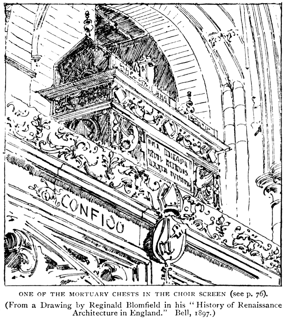 The great Reredos, which separates the presbytery from the feretory and the eastern end of the church, is, to judge from its style, late fifteenth-century work. It has been attributed to Cardinal Beaufort, and to Bishop Fox and Prior Silkstede, 56but no inscription or armorial details can be discovered to confirm either of these suppositions. It is similar in character to the altar-screens of Christchurch Priory, Hants, and S. Mary Overy (S. Saviour's, Southwark); but, less fortunate than the former, it was despoiled of all the statues which once filled its niches, while it has not "the exquisite grace of detail which marks the choir of angels at Southwark." The reredos at S. Albans, in the same style, though not so large, was erected between 1476 and 1484; and, as at Winchester before 1899, shows a cross-shaped space where, according to legend, a huge silver crucifix was placed. Now once more, as in the sixteenth century, there is a figure on the great cross. It is curious to note an attempt, during the rage for pseudo-classic architecture in the last century, to beautify the reredos by placing sham funeral urns in its niches. These were fortunately removed in 1820, and in recent years they have been replaced by a series of statues intended to reproduce as far as possible the original effect. In the Builder for October 10, 1892, a large reproduction was given of a very interesting drawing by the late Mr J.W. Sedding, showing the whole screen completely restored; but this scheme was unfortunately not used. A large oil-painting, "The Raising of Lazarus," by Benjamin West, purchased in 1782 by Dean Ogle, till 1899 hung immediately over the altar. Before 1818 a huge wooden canopy in Jacobean style, freely enriched with gold, covered all the central portion of the screen. This was due to Bishop Curie.