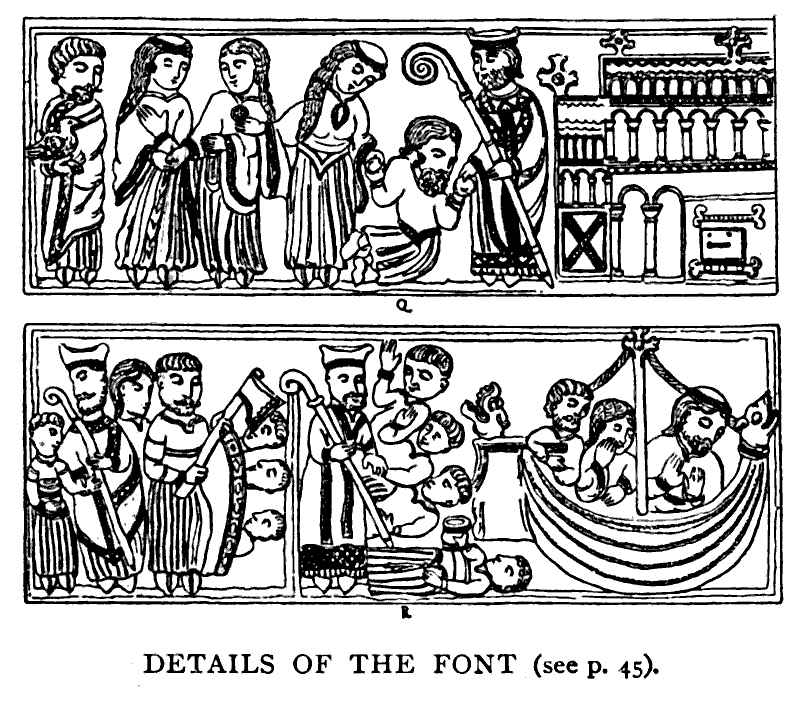 The Norman Font, which Milner called crux antiquariorum, is situated on the north side of the nave between the fifth and sixth pillars from the west front. It is one of a group of seven found in England; of which four are in Hampshire, at East Meon, S. Michael's (Southampton), S. Mary Bourne, and Winchester; two in Lincolnshire, in the cathedral and at Thornton Curtis; and one at S. Peter's, Ipswich. Of four similar fonts on the Continent, that at Zedelghem, near Bruges, is most like the Winchester example, and also illustrates the same legend. The material of which these fonts are made is a bluish-black calcareous marble, such as is still worked at Tournai in Hainault. The font before us is a nearly square block of marble supported on a solid central column ornamented with horizontal mouldings, with four disengaged pillars of lesser diameter, with "cable" mouldings, at each corner. The spandrels of the top are decorated with carved symbolic subjects, leaves and flowers on two sides, and on the other two doves drinking from vases out of which issue crosses, typifying baptism, it is said. It is rather curious that the artist has disregarded the usual symmetry, and filled his spaces without reference to the corresponding ones. On the north and east faces of the font are three circular medallions with symbolic doves and salamanders. On the south and west are scenes from the life of S. Nicholas of Myra, as was fully demonstrated by Milner; the north side showing the saint dowering the three daughters of a poor nobleman, while on the west he restores to life a drowned person, probably the king's son in one of the stories of his life, and rescues from death by the axe three young men who are about to be slain either by the executioner or by a wicked innkeeper, for there are two versions. Some authorities would find four scenes represented on the west side; but on what grounds it is difficult to see. There only appear 45to be two figures of the saint, and the two scenes are divided by what looks like a short vertical bar indicating a difference of subject (see p. 117). The cult of S. Nicholas of Myra grew rapidly in the twelfth century, being popularised by the crusaders. In this century it is known that the carved work at Tournai, whence it is probable that the black marble came, was remarkable for its symbolism. The font has been thought to be older, on account of its archaic figures, but, as the Dean of Winchester pointed out in a paper read before the Archæological Association in 1893 (to which we are indebted for much of this account), the mitre which S. Nicholas is represented as wearing was not recognised as part of a bishop's official dress until the very end of the eleventh century; in fact, the particular form of mitre depicted appears to have been late twelfth century. The conclusion naturally arrived at is that the font is of Belgian origin, carved at Tournai between 1150-1200, and its presence at Winchester may well be due either to Henry of Blois or to Toclive.