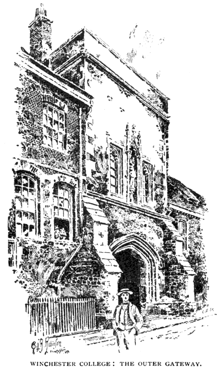 On Wykeham's charter for the incorporation of his new foundation, "Seinte Marie College of Wynchestre," is the date October 20, 1382; but it seems that long before this date and up to the actual completion of the College buildings, the bishop superintended the education of the boys for whom his 119institution was founded, housing them in temporary structures in the meantime—possibly in S. John's parish, on S. Giles' Hill, it has been suggested. Before Wykeham's time, and indeed before the Conquest, it appears that the monks of S. Swithun's institution had a school at Winchester, at which no less celebrated a pupil than Alfred the Great was brought up. We have already touched on the subject of Wykeham's ideas on education, and the change which he brought about by his colleges at Winchester and Oxford, and it is not necessary to go into the subject again. The College buildings lie beyond the southern limits of the cathedral close, on the south side of the narrow College Street, being entered by a gateway with an ancient statue of the Virgin in the niche over it. This door leads into the quadrangle, about which are ranged various parts of the college. A further arch under the tower in this court leads to a larger quadrangle, in which are the Chapel and the refectory or Hall, a room 63 feet by 30, 120