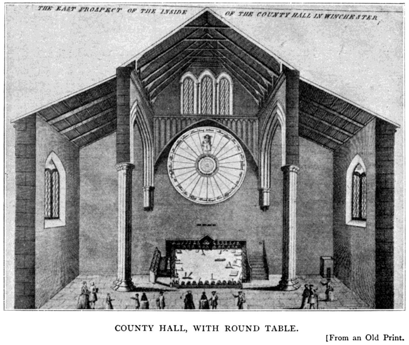 Of other points of interest in or near Winchester it would be out of place to speak here at any length, but among the various objects that are worth seeing in the town itself mention may be made of the City Cross, erected by the Fraternity of the Holy Cross during the reign of Henry VI. The chief figures represent William of Wykeham, Florence de Anne, Mayor of Winchester, Alfred the Great, and S. Laurence, the latter being the only old figure. Britton, in 1807, said: "The present building is called the Butter Cross, because the retail dealers in that article usually assemble round it." He complained of the injury done to it by "boys and childish men." S. Laurence was the only figure in his day, and it was then "generally said to be an effigy of S. John the Evangelist." In the County Hall, which includes the remains of the ancient castle of William the Conqueror's days, is "King Arthur's Round Table." This is mentioned as being here by the chronicler John Harding (1378-1465), so that its antiquity is undoubted. Its present painted design, however, can not be earlier than the beginning of the sixteenth century, but since Henry VIII.'s time the same design has been adhered 132to. The illustration which appears here comes from an old print of the County Hall. Milner, in his "History and Survey of Winchester" in the last century, remarked that the Round Table "was evidently an eating table for the knights who used to meet here to perform feats of chivalry, which kind of meetings, from this circumstance, was anciently called The Round Table. These, however, were not so much as known in England, until the reign of King Stephen, 600 years after the reign of Arthur. There is great reason to believe that the said Stephen was the real author of the present table. The figures and characters now painted on it were certainly first executed in the reign of Henry VIII."