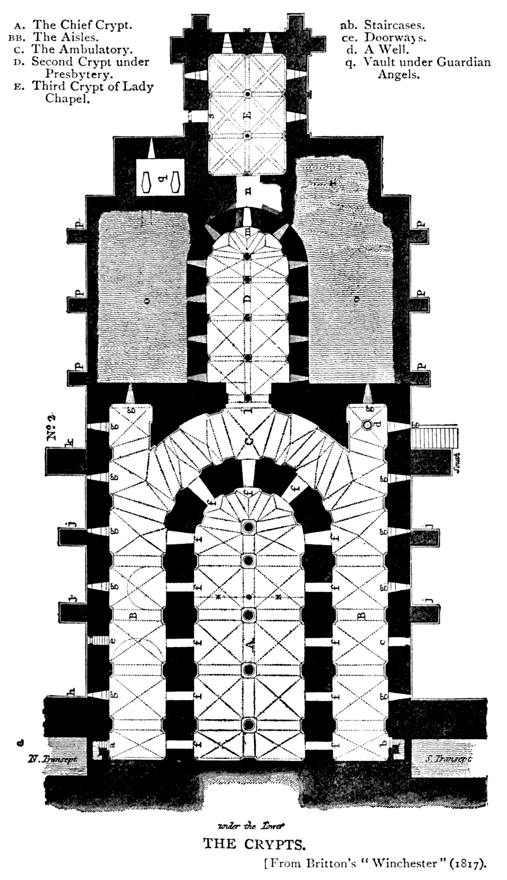 It will perhaps be most convenient to deal at this point with the Transepts, of which the western walls are almost level with the choir-screen. Having been but little injured by the fall of the tower in 1107, they still remain to a great extent what they were when originally built by Walkelin. We therefore get the massive and rugged early Norman walls still divided into the three nearly equal storeys which in the nave have given place to two. Where the fall of the central tower necessitated a partial rebuilding, the difference between the Early and the Late masonry is very evident. That of the transepts generally is coarse and very thick, as is the case with all Early Norman stonework. The new masonry, on the other hand, recalls what William of Malmesbury says of the Later Norman masonry at Salisbury, when he speaks of "the courses of stone so correctly laid that the joint deceives the eye, and leads it to imagine that the whole wall is composed of a single block." The juncture of the two works at Winchester can be easily traced. Of the general style of the transepts, Willis says: "The architecture is of the plainest description. The compartment of the triforium is very nearly 62of the same height as that of the pier-arches, and the clerestory is also nearly the same height.... Each pier-arch is formed of two orders or courses of voussoirs, the edges of which are left square, wholly undecorated by mouldings. This is the case with the pier-arches of Ely transept, but in the arches of the triforium at Ely, and in every other Norman part of that cathedral, the edges of the voussoirs are richly moulded. In Winchester transept, on the contrary, the arches of the triforium and clerestory are square-edged like those of the pier below and hence arises the peculiarly simple and massive effect of this part of the church." Between the tower-piers and the terminal walls of each transept there are three piers, making four compartments, the farther two of which from the nave and choir open into the terminal aisles. The arches were all originally plain, semi-circular, and square-edged, and are supported by shafts with the cushioned capitals so characteristic of the ruder Norman style, and the bases are simple with a chamfer and quarter-round, very different from the ornamental Late Norman bases, such as may be seen at S. Cross, Winchester, for example. Where the Later Norman work has taken the place of the original, we find stronger piers. The vault above is groined, but there are no ribs. Nothing, however, can now be seen of the vaulting above the level of the side-walls, since a flat wooden ceiling, painted in "Early Tudor" style was put up in 1818, by which, among other things, the rose-window in the gable of the north transept was hidden, though in Britton's view, which we give on page 59, we have the transept previous to the timbering. Each transept has an eastern and a western aisle, while at the extreme ends there are aisles rising to pier-arch level, consisting of two arches, which a triple bearing-shaft supports in the centre. A kind of gallery is formed at the terminations of the north and south transepts, over and beyond which may be seen the triforium and clerestory windows. This can best be appreciated by a reference to the illustration, Plate XV. Possibly this platform or gallery was not originally so bare as it appears at the present day, but there is no doubt that it was built in order that processions might pass round on the triforium level.