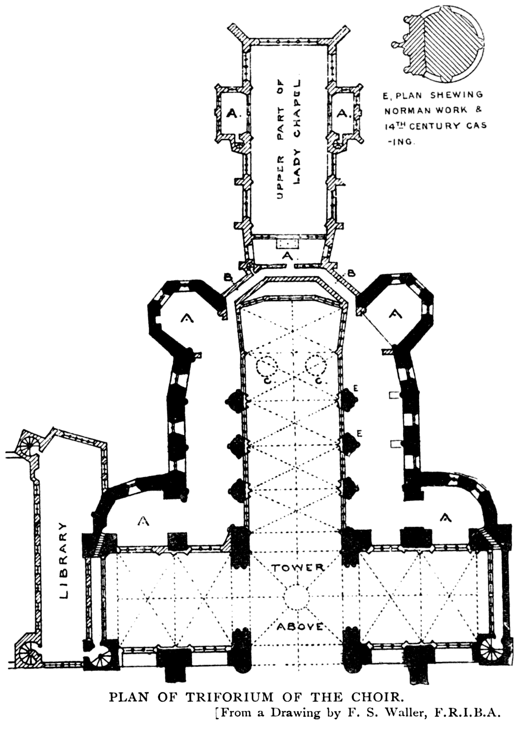 Nothing is known exactly as to how much of the building was completed by 1100. Professor Freeman points out that eleven years was quite long enough for its building, and that there is no hint in the local chronicle of any additions being made to the building dedicated in 1100. Probably part of the church was finished for the dedication, such as the presbytery, choir, the transepts, the Abbot's cloister, the chapter-house, and the greater part, at any rate, of the nave.