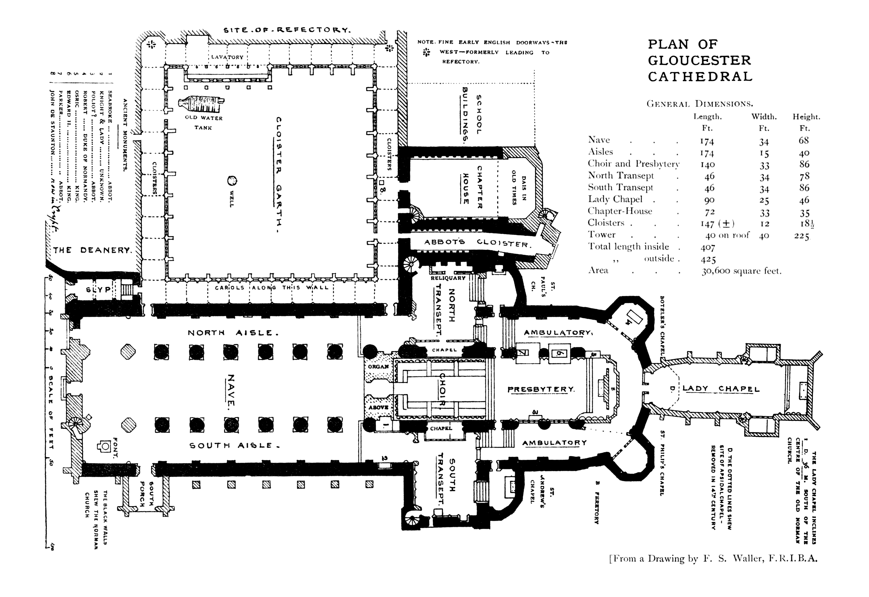 I wish to express my great obligations to Mr F. S. Waller (the Cathedral Architect) for his courtesy and kindness in allowing me to make the fullest use of his "Notes and Sketches" of the Cathedral, a book which is now, unfortunately, out of print; to Mr W. H. St. John Hope, F.S.A., for permission to quote from his "Notes on the Benedictine Abbey of St. Peter at Gloucester," published in the Records of Gloucester Cathedral; also to the Records of Gloucester Cathedral.