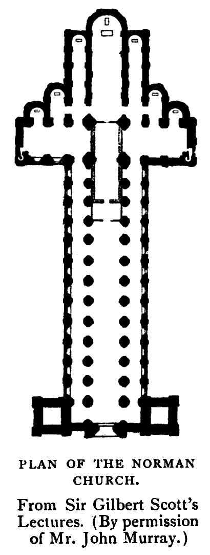 We can form a good idea of this Norman church. It was like several of the other cathedral and abbey churches built at the same time, of vast size, far grander than their prototype in Normandy, St. Stephen's at Caen. The following table gives approximately the dimensions of some of these churches: