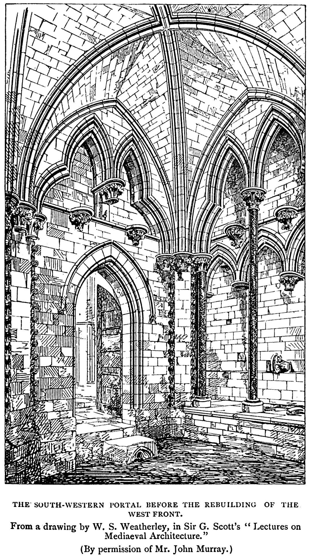 The West Front. We will begin our examination of the existing exterior with the west front, and then proceed in order round the building along the south side, east end and north side, although in reality iron railings will prevent us from making a complete circuit, and necessitate our retracing our steps and making a fresh start at the west of the railings. Still there is no part of the exterior to which we cannot gain easy access.